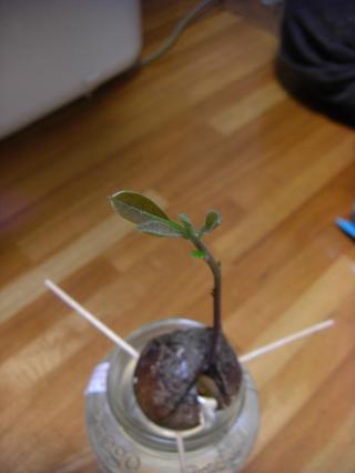 そこで残った種。こいつをカップとか空き瓶(鮭フレークの瓶とか)に浮かべてて育てていくのですが、彼一人の力で浮かぶことはできないので、爪楊枝を3本種に刺してささえてあげます。そうですメルセデスベンツのマークみたいに12時・4時・8時の角度です。
