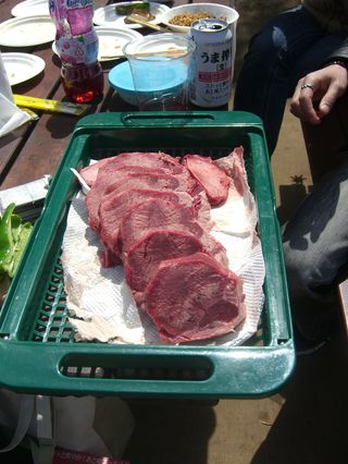 ということでここは葛西臨海公園BBQサイト。川崎からTOSHI鈴木さんご一家も参戦!!しかも珍獣の舌ブロック持ち込み!!そう牛タンです!!