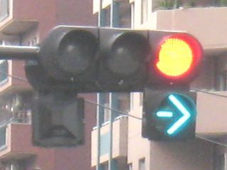 青色の矢印信号は、赤信号で他の車の進入が止められている時に、右折車だけを進行させることで交差点での渋滞を防ぐ目的がある。しかし、Uターンは禁止されているため、右側車線の先頭の車がUターンしようとする場合、後ろの車の渋滞を招く状況になっていた。